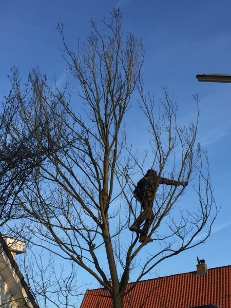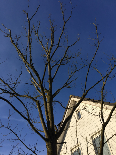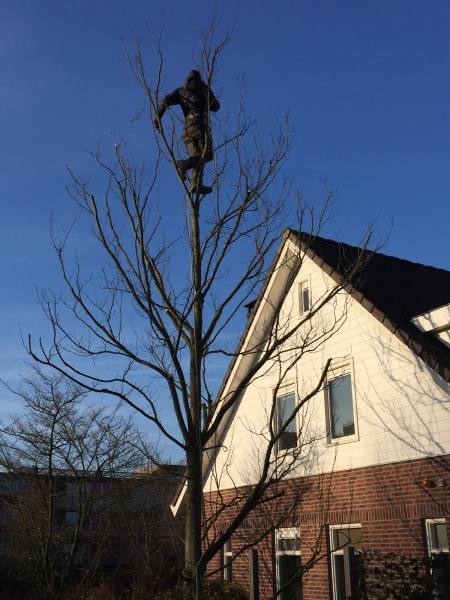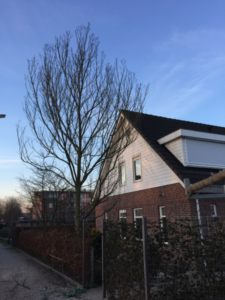 De boom is een stuk terug gesnoeid omdat hij toch wel behoorlijk dicht bij de woning staat, en zo gesnoeid dat de boomkruin binnenin ook weer lichtval krijgt. Zo ziet u maar snoeien is een vak apart!